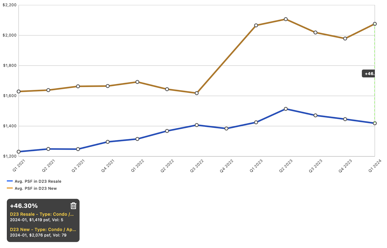 New launches in D23 were averaging $1,256 PSF, and resale units were going for an average of $1,057 PSF.