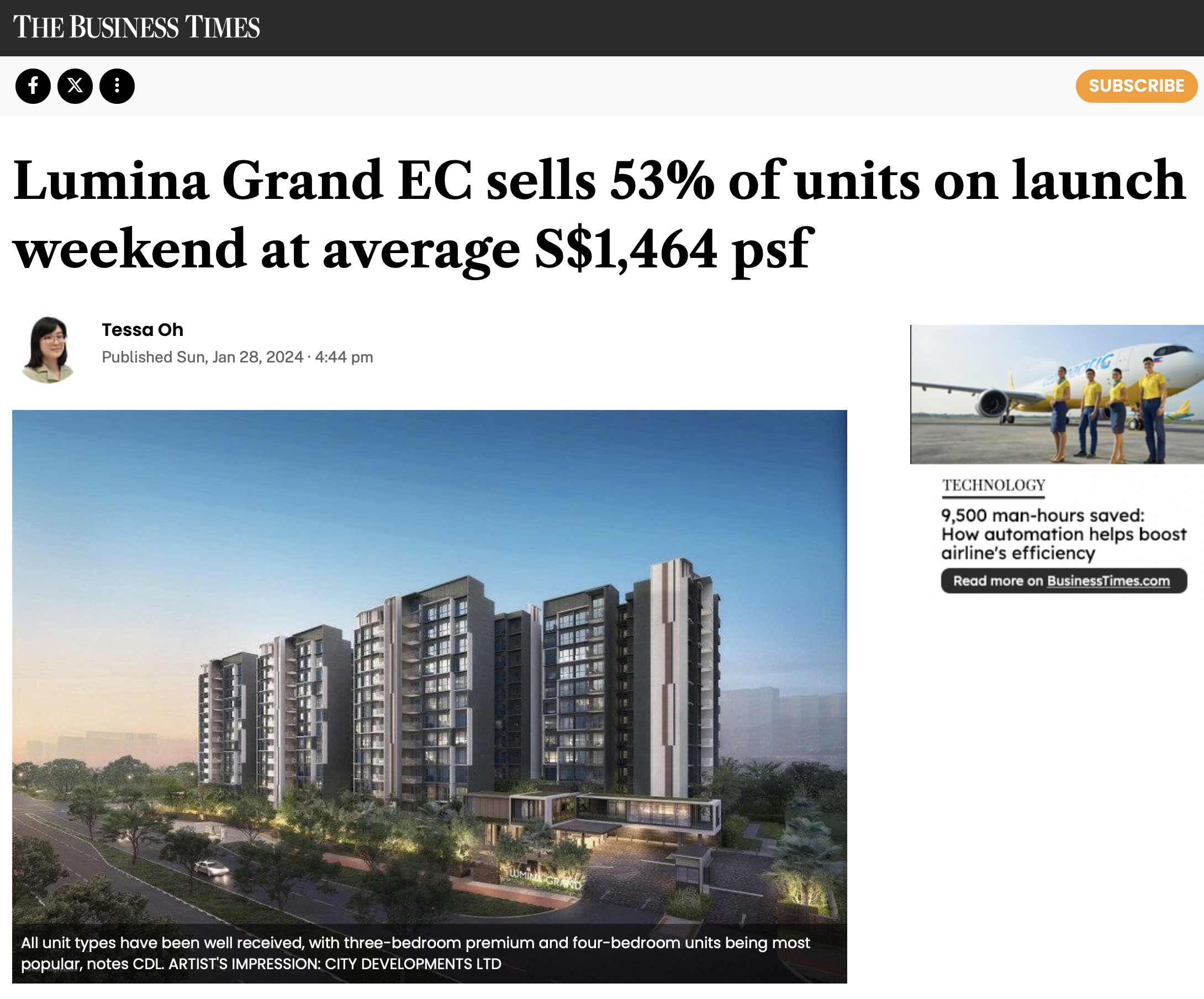 Lumina Grand that went on sale last weekend saw 53% of their units snapped up at launch, which is no easy feat considering the average PSF of $1,464 PSF. The smallest 3BR unit at 936 square feet will cost upwards of $1.35 million.